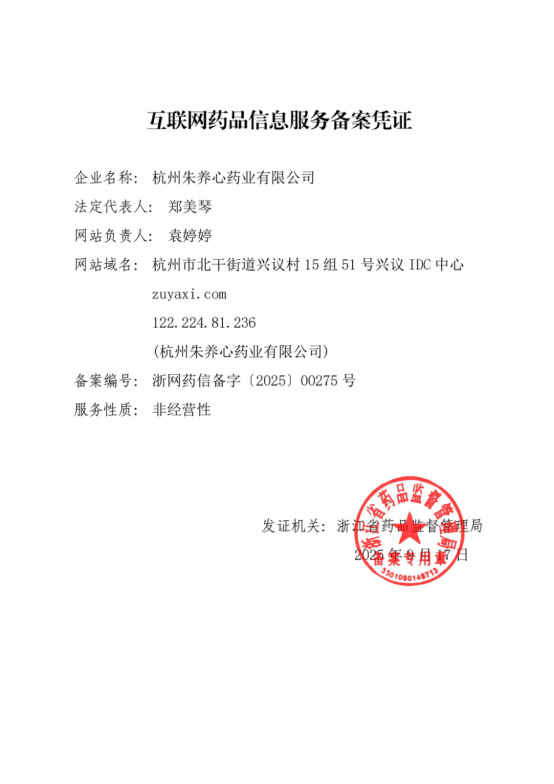 杭州朱養心藥業有限公司 版權所有(C)2018 網絡支持 生意寶 著作權聲明 | 互聯網藥品信息服務資格證:浙網藥信備字(2025)00275號 | 備案號:浙ICP備17013804號-1 浙公網安備 33019202000230號
